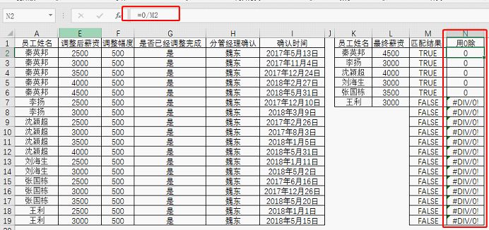 然后再用0除以M列中的结果,由于四则运算中TRUE表示1,FALSE表示0,所以就会得到0或者#DIV/0! 两种结果。