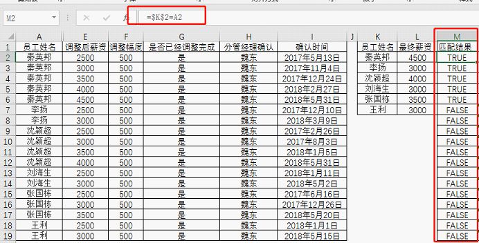 以秦英邦为例,在M2单元格输入=$K$2=A2,鼠标放置在M2单元格右下角,向下拖动填充至M19单元格。K2单元格依次与A列中所有姓名进行匹配,相同则返回TRUE,不相同则返回FALSE,如下图所示:
