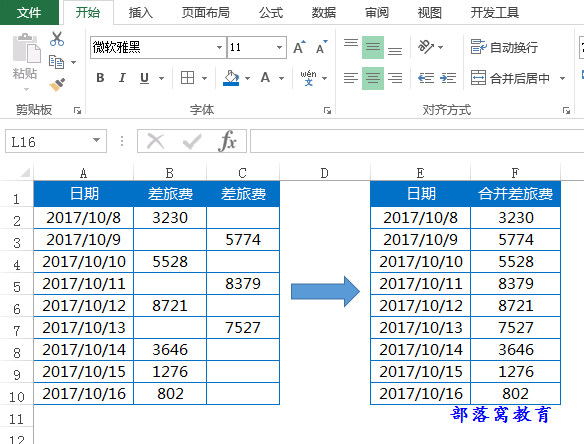 比如在我们日常工作中,总会有一些表格需要多人或多部门协作填写,例如下面的表格,分别是两名工作人员填写的差旅费用,B列是一个人填写的,C列是另外一人填写的。最后我们需要把它们汇总到一起,形成最终完整的表格。效果如EF列。
