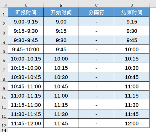 小黄鹂从事的是人资行政方面的工作,由于工作需要,经常需要制作会议安排,每次最头疼的就是汇报时间段的录入,最终所需的效果如图所示。