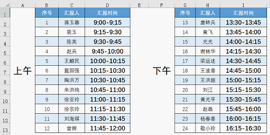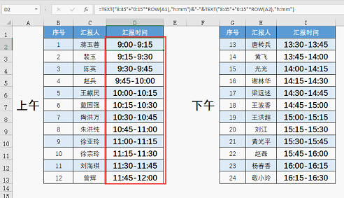在学习了Excel公式之后,小黄鹂有了一个念头,能否设计出一个公式,自动生成每个人的汇报时间段呢,如果真的实现的话,那简直就太美了……