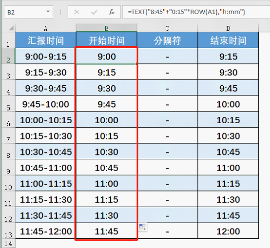 =TEXT("8:45"+"0:15"*ROW(A1),"h:mm")&"-"&TEXT("8:45"+"0:15"*ROW(A2),"h:mm"),结果如图所示。