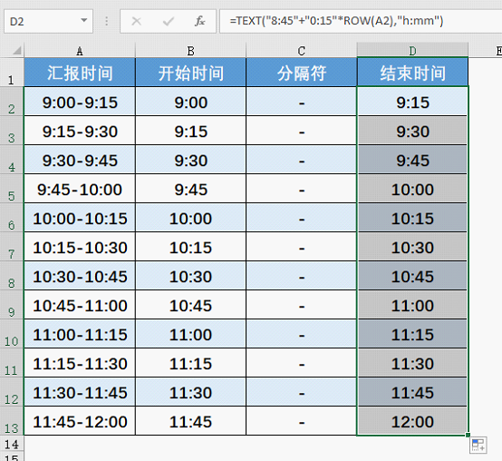 类似的,结束时间可以用公式=TEXT("8:45"+"0:15"*ROW(A2),"h:mm")得到,结果如图所示。