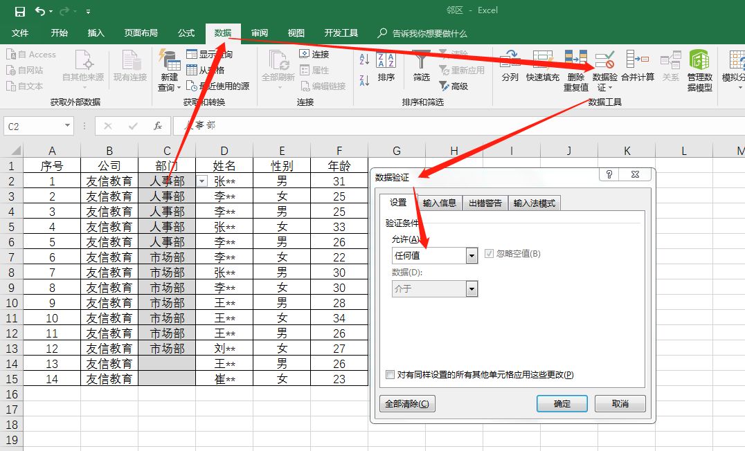 第一种方法是删除序列数据验证,这样就可以在单元格中输入任何字符。单击【数据】—【数据验证】打开【数据验证】对话框,将验证条件设置为任意值,操作如下图: