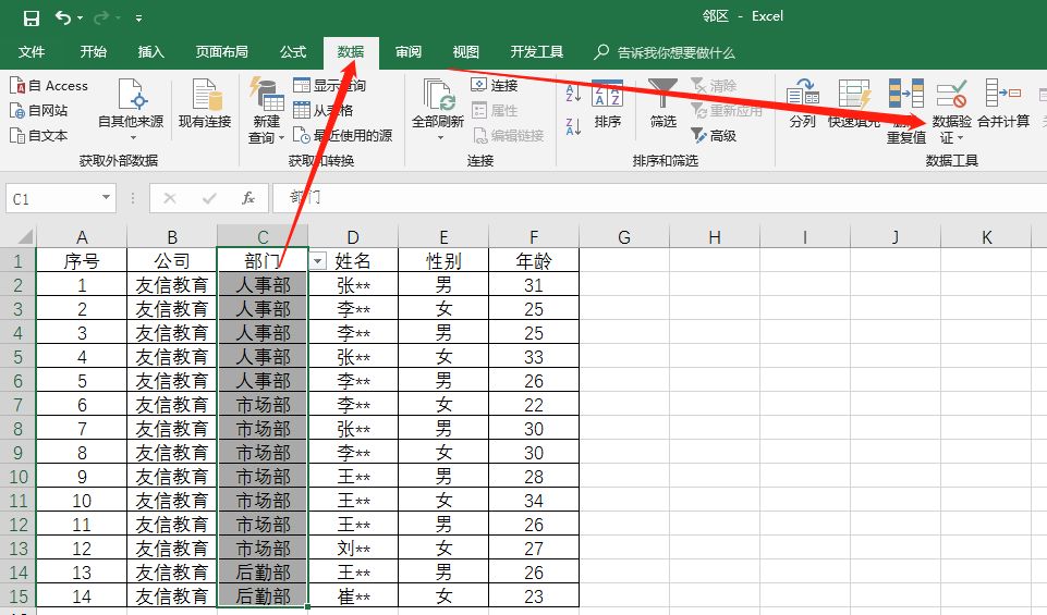 选中C列数据后单击【数据】选项卡,选择【数据验证】按钮。