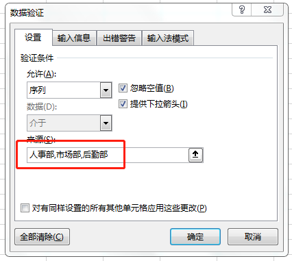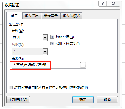 在【数据验证】对话框中选择【设置】—【验证条件】—【允许】中的【序列】,在下方【来源】文本框中输入我们要设置的字符内容。此处可以手工输入,多个内容以英文状态下的逗号隔开,也可以直接引用某个区域单元格中的内容。本例以手工输入“人事部、市场部、后勤部”为例。完成输入后单击【确定】按钮。