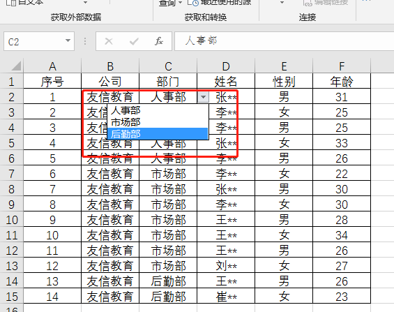 看到小美发过来的截图我才明白其中的原因。原来领导为了避免下发表格数据被各部门随便改动而做了下拉菜单,这样数据录入人员只要根据自己部门在下拉菜单选择就可以,不用手工输入。既提高了工作效率又保证了表格的准确性。但是由于后勤部是新增部门,录入时就出现了小美遇到的问题。