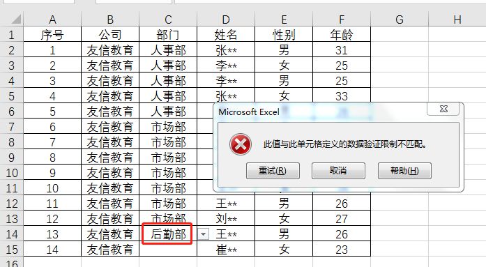 小美说由于公司新成立后勤部,HR经理要求她把后勤部相关数据汇总到公司部门信息库中,当她输入后勤部字符时却显示错误,提示“此值与单元格定义的数据验证限制不匹配”错误。经理要求上午就做完,现在连文字都不能输入,所以才前来求助。