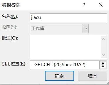 首先定义名称,新建一个为“jiacu”的名称,设置引用位置为:=GET.CELL(20,Sheet1!A2),如下: