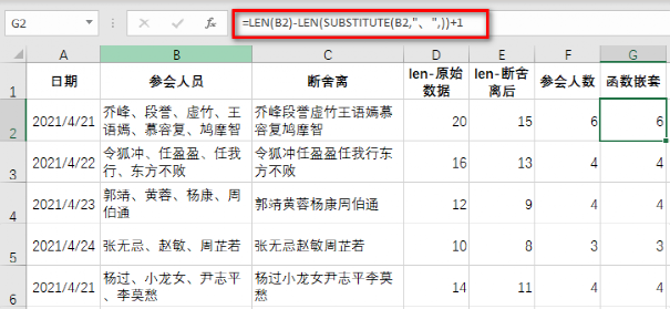 如下图所示,B2至B6单元格中的数据是参会人员的名单,在每个人名之间,用中文输入法下的顿号(、)分隔,现在需要统计每一天的参会人数。