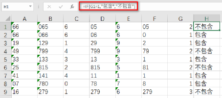 再对G列中的数据进行一个IF判断,在H1中输入“=IF(G1=1,"包含","不包含") ”,就OK了。