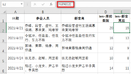 在D2、E2中分别输入“=LEN(B2)”、“=LEN(C2)”,得到如下结果。