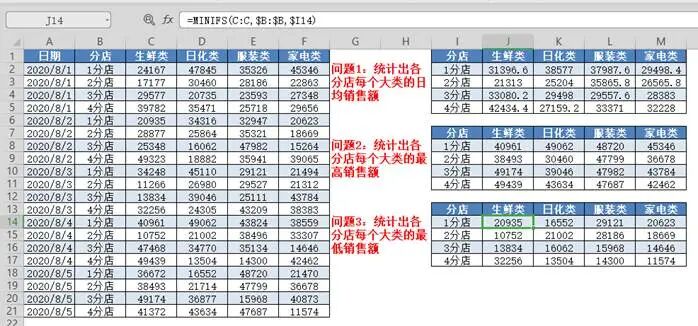 可用AVERAGEIF函数。公式是=AVERAGEIF($B:$B,$I2,C:C),结果如图所示:AVERAGEIF函数计算某区域内符合指定条件的单元格的平均值。AVERAGEIF函数的用法有两种。第一种:三个参数,格式为AVERAGEIF(条件匹配区域,条件,求值区域)。本例中条件是I2单元格,考虑到公式需要右拉和下拉,所以参见参数使用$进行了锁定。第二种:两个参数,格式为AVERAGEIF(条件匹配与求值区域,条件)。条件匹配区域与求值区域合二为一。譬如求生鲜类销量大于20000的销售平均值,在O2单元格输入公式=AVERAGEIF(C2:C21,”>20000”),结果如图:如果求公司每个店每类产品的日均销量,那就更简单了,只用AVERAGE函数即可解决。如图: 统计了大于20,000的销售平均额。那到底生鲜类销售大于20,000的有多少个呢?可以使用CONUTIF函数。在O3单元格输入公式=COUNTIF(C2:C21,”>20000”)即可。关于COUNTIF函数在销售统计中的更多用法可以查看之前的文章。