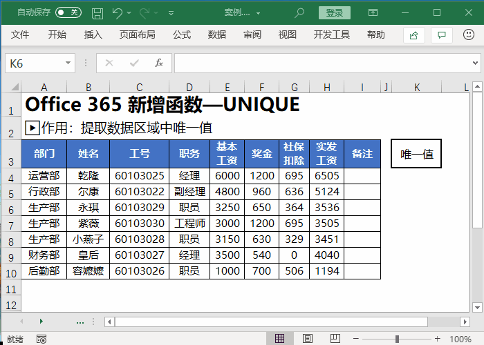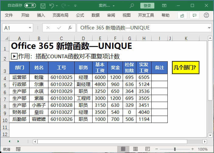 学会了UNIQUE函数以后,我们可以搭配COUNTA函数统计不重复的部门个数。