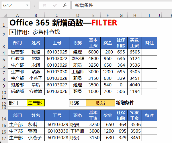 案例中我们新增职务条件,然后在A15单元格录入条件公式: