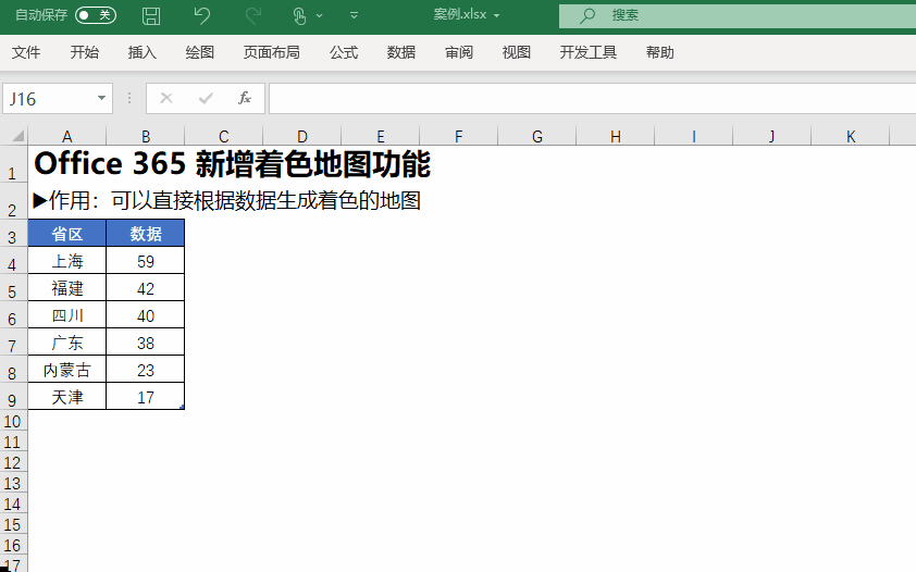很多可视化数据中都会用到地图着色的图表,之前低版本用VBA去写代码才能实现,现在在Office365版Excel中可以选中数据后直接插入着色地图。