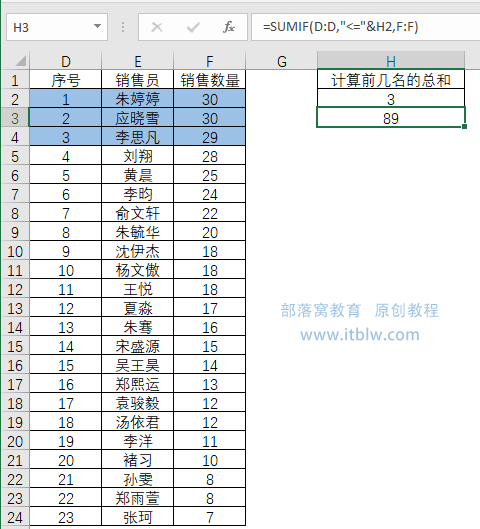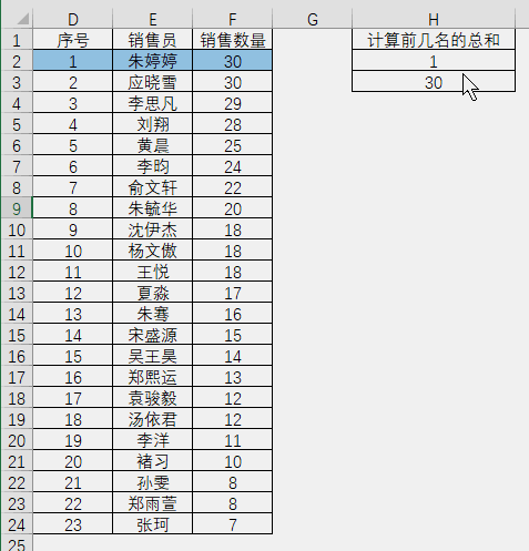 可以看到,数据按照销售数量从高往低排列,选择一个名次,就可以对前几名的销售数量求和。这类问题在很多与数字排名有关的情况下都用得上,例如对前几名考试成绩求和,对前几名的客户订货量求和等等……