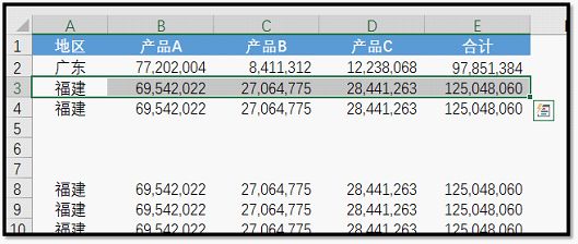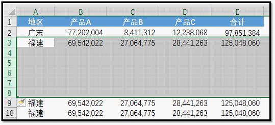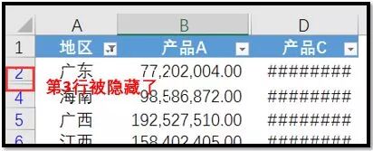 例如下图中第三行被隐藏了(图中为筛选隐藏,也有可能是我们刚刚讲过的拖动隐藏)。