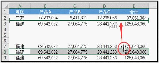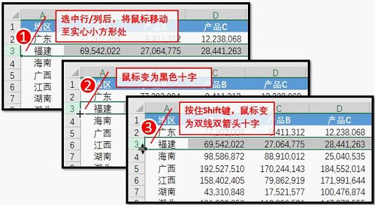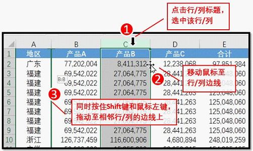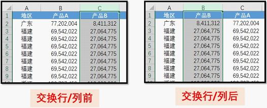 更特别的是,如果我们选择将一行或一列Shift拖动插入到相邻行/列位置上,就可以实现所谓的“交换行/列”。