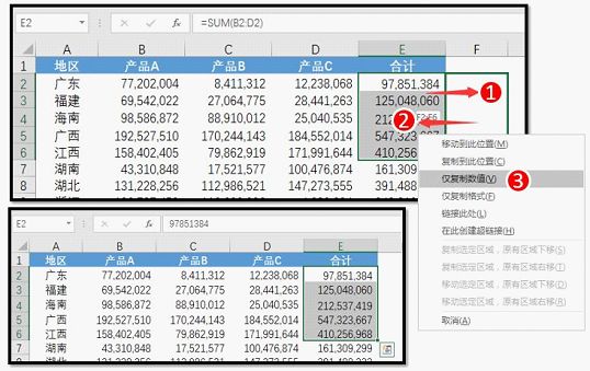 选中连续单元格区域,按住鼠标右键向任意方向拖动再拖动回原位置(注意过程中不要松开鼠标右键),选择【仅复制数值】,搞定!