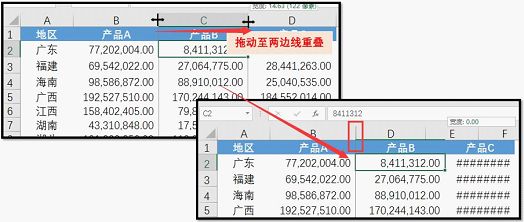 skill 2:向上拖动某一行边线或向左拖动某一列边线至该行/列的两条边线重叠,即可隐藏该行/该列。继续向上或向左拖动该边线,就可以隐藏多行/列。