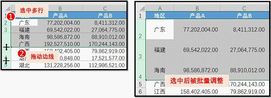 skill 1:选中多行后,拖动调整任意一行或一列的行宽或列宽,则所有选中的行或列都被批量调整至相同行高/列宽。