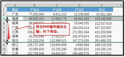 step 2 保持按住Shift键,同时按住鼠标左键,向下拖动或向右拖动,使选中的行/列的下边线或右边线与其他行或列的边线重叠;