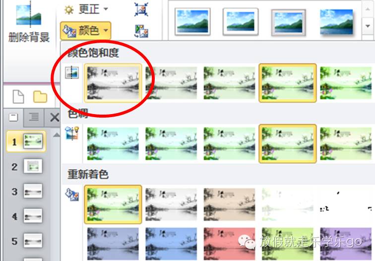 2,将图片改为灰度图片:双击图片(自动激活图片格式编辑工具),点击“颜色”(位于左上角),选择“颜色饱和度”中的第一项(饱和度为0)为图片去色,使图片成为灰度图片。