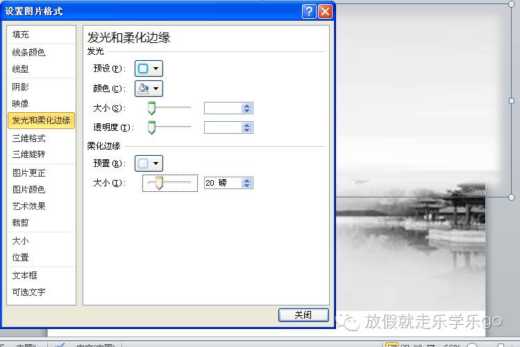 11,右键单击图片,选择“设置图片格式”,打开“设置图片格式”对话框。调整图片柔化值(剪裁位置大小不同柔化值也会有所不同),同时注意调整图片大小和位置。