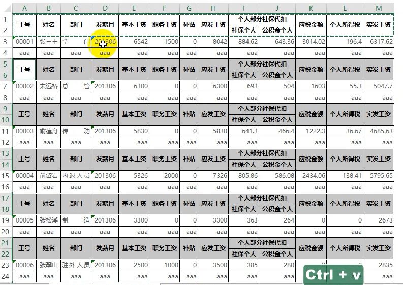 按CTRL+V粘贴刚才复制的表头,此时,每条员工工资明细数据上就都有了表头数据。
