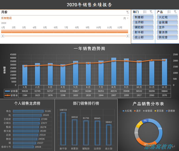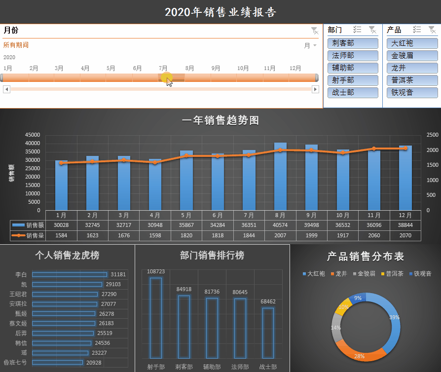 5、用同样的方式,依次美化其他几个图表,再美化切片器和日程表,调整位置以及大小,整个年终报告就搞定了,来看看最终的样子: