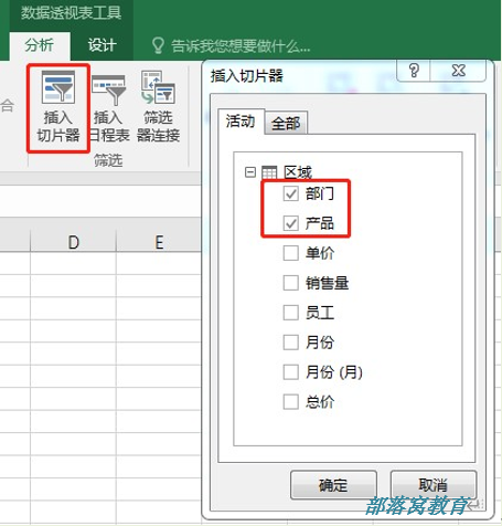 先随意选中一个透视图,然后在分析菜单中找到“插入切片器”,选择部门和产品,点击确定。