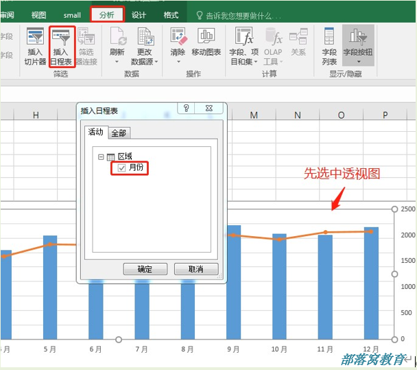先随意选中一个透视图,然后在分析菜单栏中找到“插入日程表”,选择月份,点击确定。
