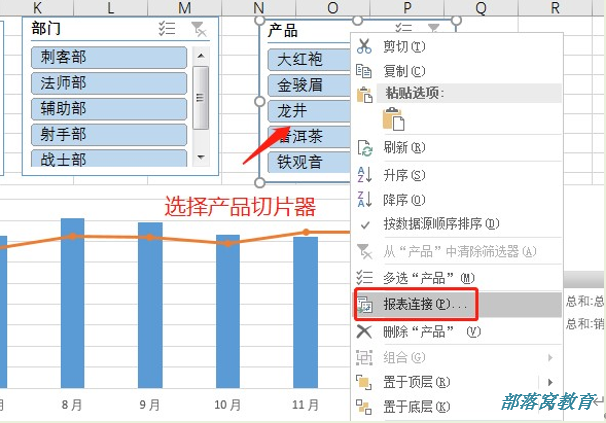 选择产品切片器,单击鼠标右键,选择“报表连接”:
