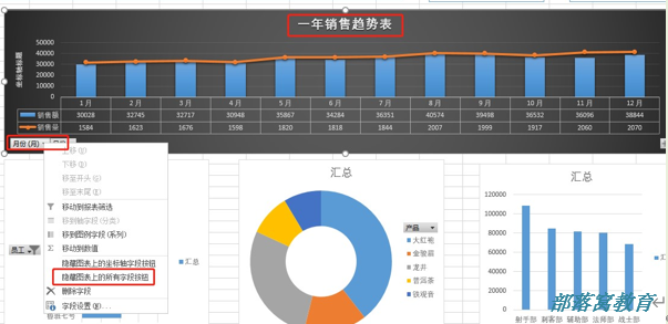 3、修改报表标题为“一年销售趋势图”,隐藏图表上的所有字段按钮。