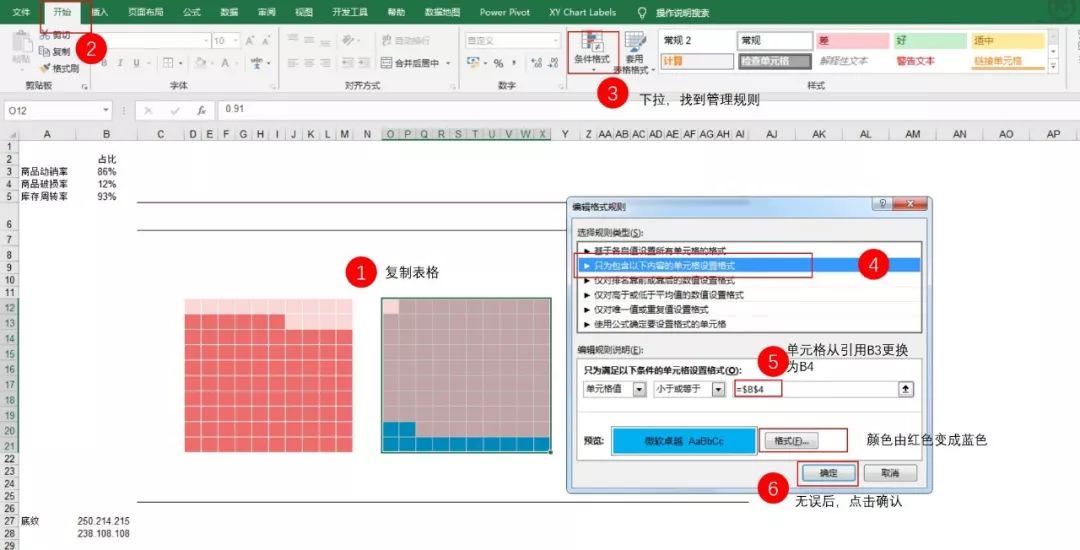 复制好后,再依次修改两个表格中条件格式。如下图所示,依次修改表格中条件格式的数值和颜色。