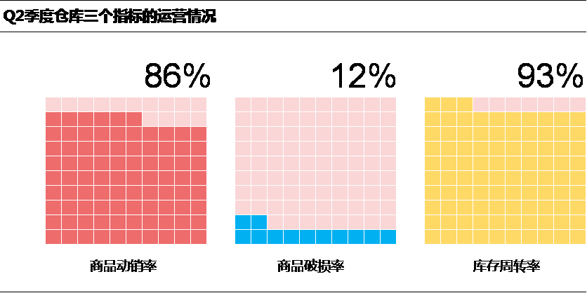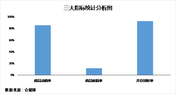 公司新来的职员小明,在公司中担任仓库管理员一职。年中季度会议即将召开,上级要小明发一份数据给他,要求展示仓库产品的动销率、商品破损率以及库存周转率。小明从系统中导出相关的数据,在对数据做初步的清洗和过滤后,最终计算出这三个指标的值:动销率86%,破损率12%,库存周转率93%。
