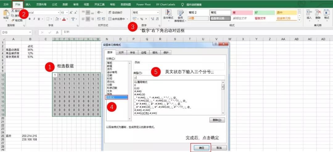 Step 03 框选数据,接着在“开始”界面,点击“数字”浮动框右下角的箭头,调出“设置单元格格式”的界面。点击“自定义”,在“类型”处输入三个英文状态下的分号“;;;”。这么做是为了隐藏表格中数据。