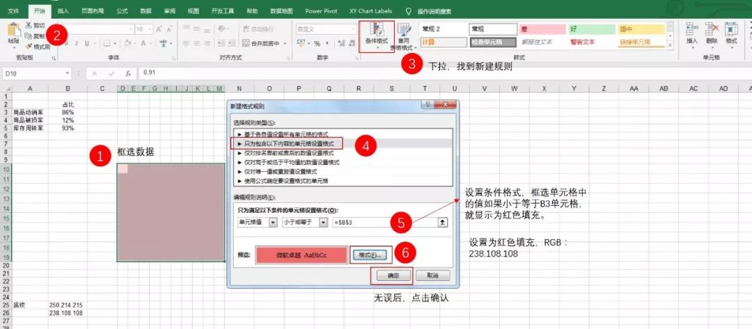 Step 05 框选数据,对数据设置条件格式。条件格式:如果框选区域内数据小于或等于86%,即填充颜色为红色,RGB为238.108.108.