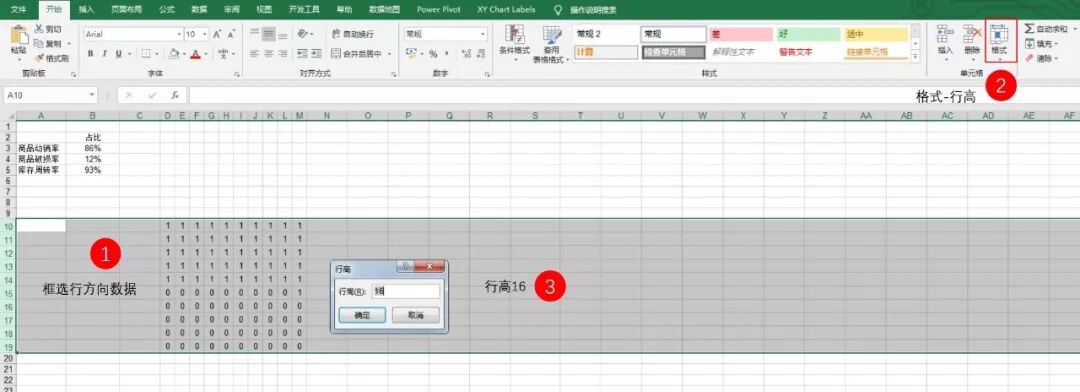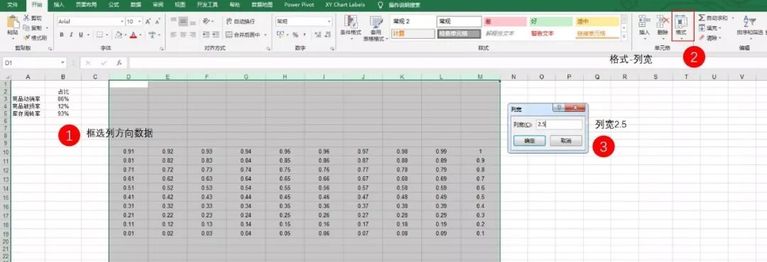 Step 02 调整数据区域的行高和列宽,将行高设置为16,列宽设置为2.5,操作如下图所示。