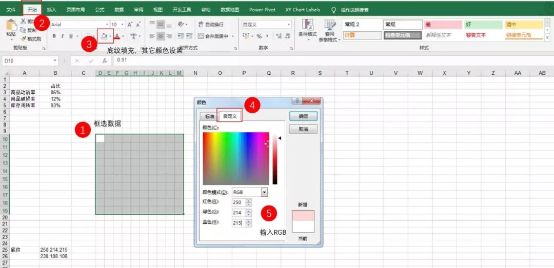 Step 04 隐藏完表格中的数值后,将数据区域的颜色填充为250.214.215,如下图所示。