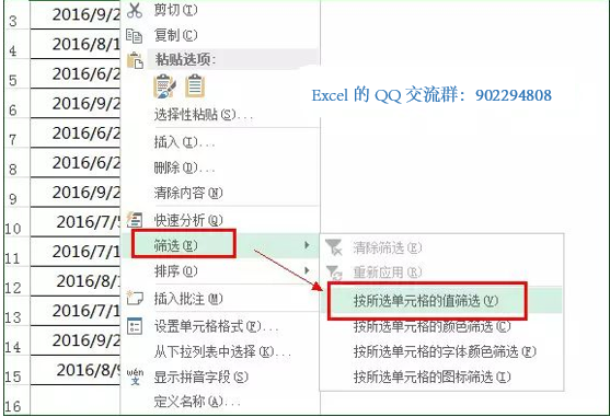 我们只需要在A列任意有数据的单元格,单击鼠标右键,选择:筛选——按所选单元格的值筛选。就可以迅速筛选出当天的日期。