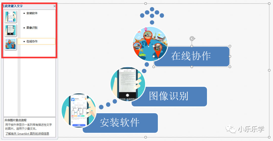 类似上述两个PPT页面,我们在使用幻灯片时,经常会需要呈现多幅图片,不同图片之间甚至还有并列、推理递进、发展演变,对比等关系,我们应该如何处理呢?今天小乐和你分享一招——SmartArt 图形,轻松解决这个难题。
