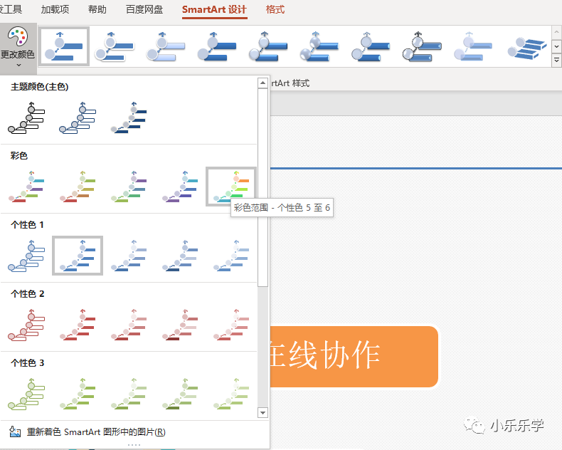 步骤5:根据需要更改“SmartArt设计”中的颜色及样式即可,此处选择的是“彩色范围—个性色5至6”