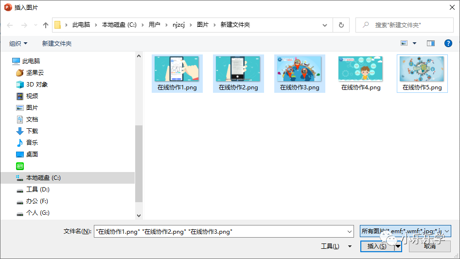 步骤1:打开PPT,选择“插入”——“图像”——“图片”,一次性选择需要的多张图片插入