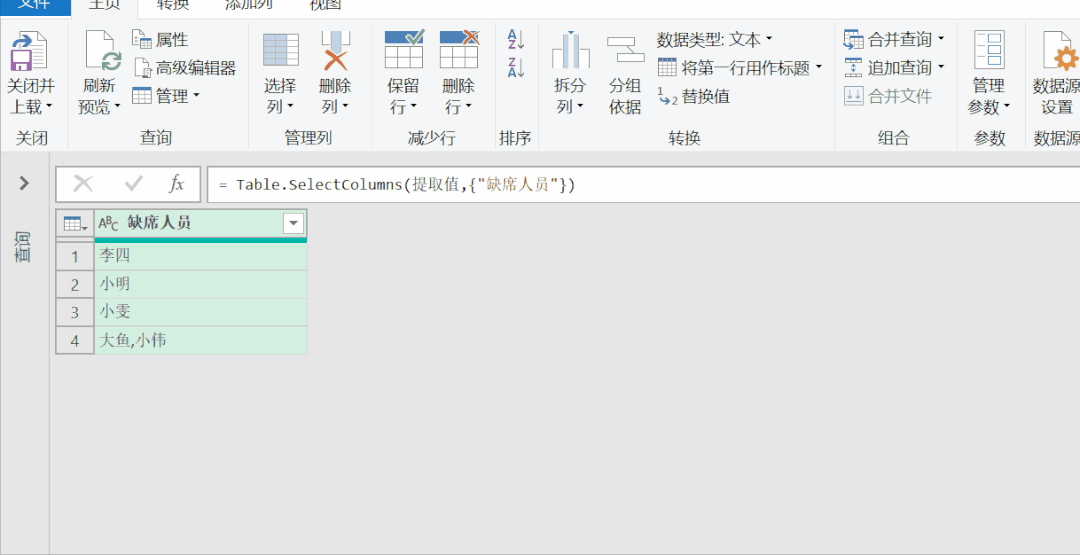 最后,可以只保留“缺席人员”这一列,删除其他列。然后将数据加载到工作表中。