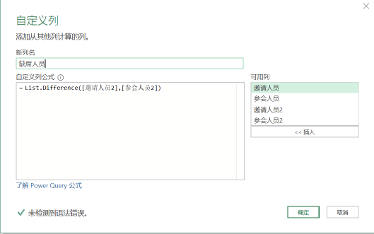 Difference英文意思就是不一样的,所以引申下这个函数就是找不同。List.Difference([邀请人员2],[参会人员2])也就是在“邀请人员2”中找跟“参会人员2”中不同的人员,找出来的就是缺席人员名单了。