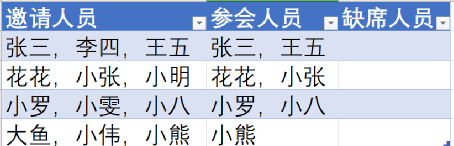 下图需要根据邀请人员,参会人员,查找出缺席人员名单。问题本质上其实也是替换的问题,但是参会人员名字在邀请成员名单中并不连续,就不好套用上面的两大替换函数了。