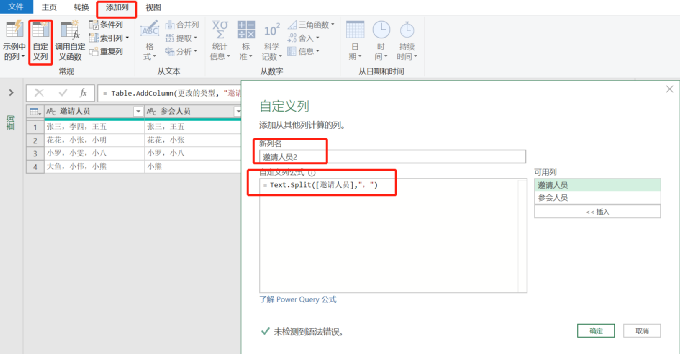 用鼠标点击“添加列”,“自定义列”。在弹出的自定义列编辑器中输入M函数:=Text.Split([邀请人员],",")。