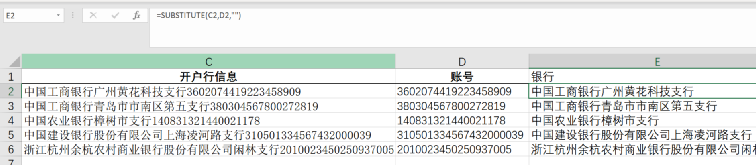 例1:已知开户行信息和账号需要提取银行名称。(如下图),这时就可以利用SUBSTITUTE函数替换。